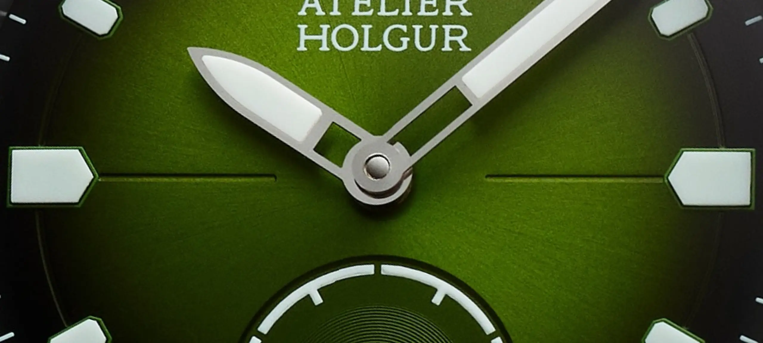 The Atelier Holgur Frømand Edition Fumée Ocean Emerald is fitted with a refined sunburst fumé green dial and a small-seconds subdial with fine concentric circles. Both the main dial and the subdial receive a gradient treatment that is brighter in the center and fades to squid-ink black at the edge.